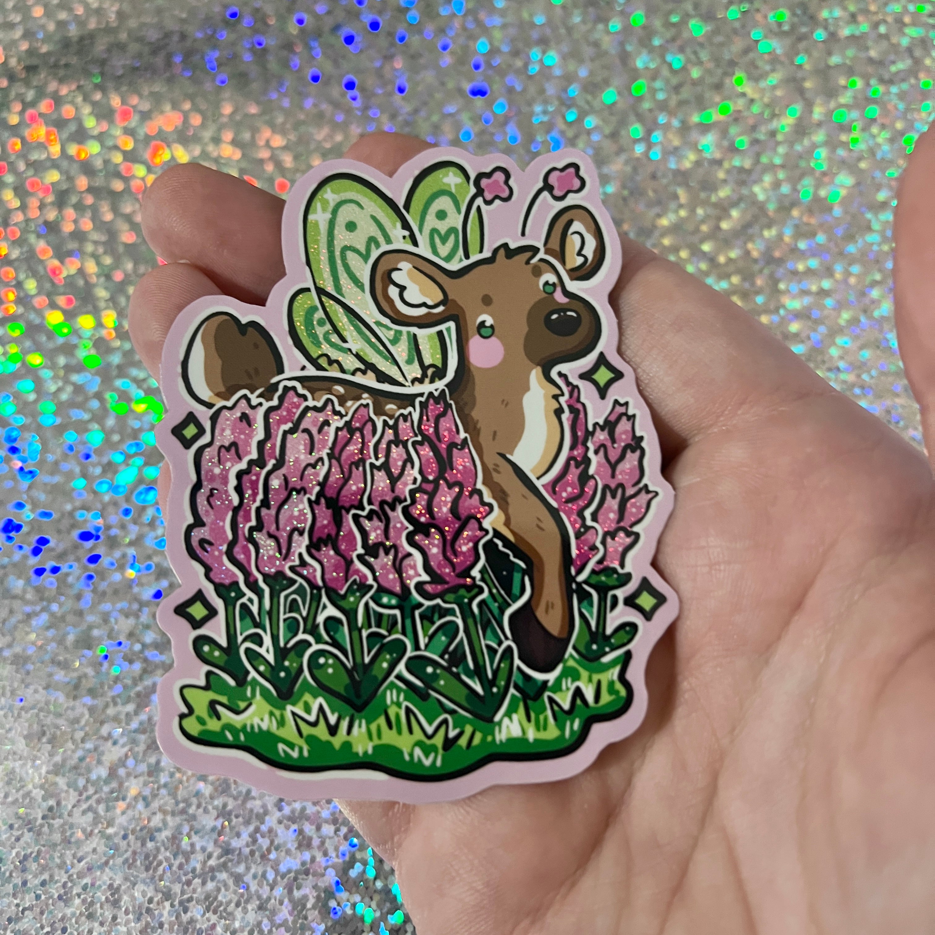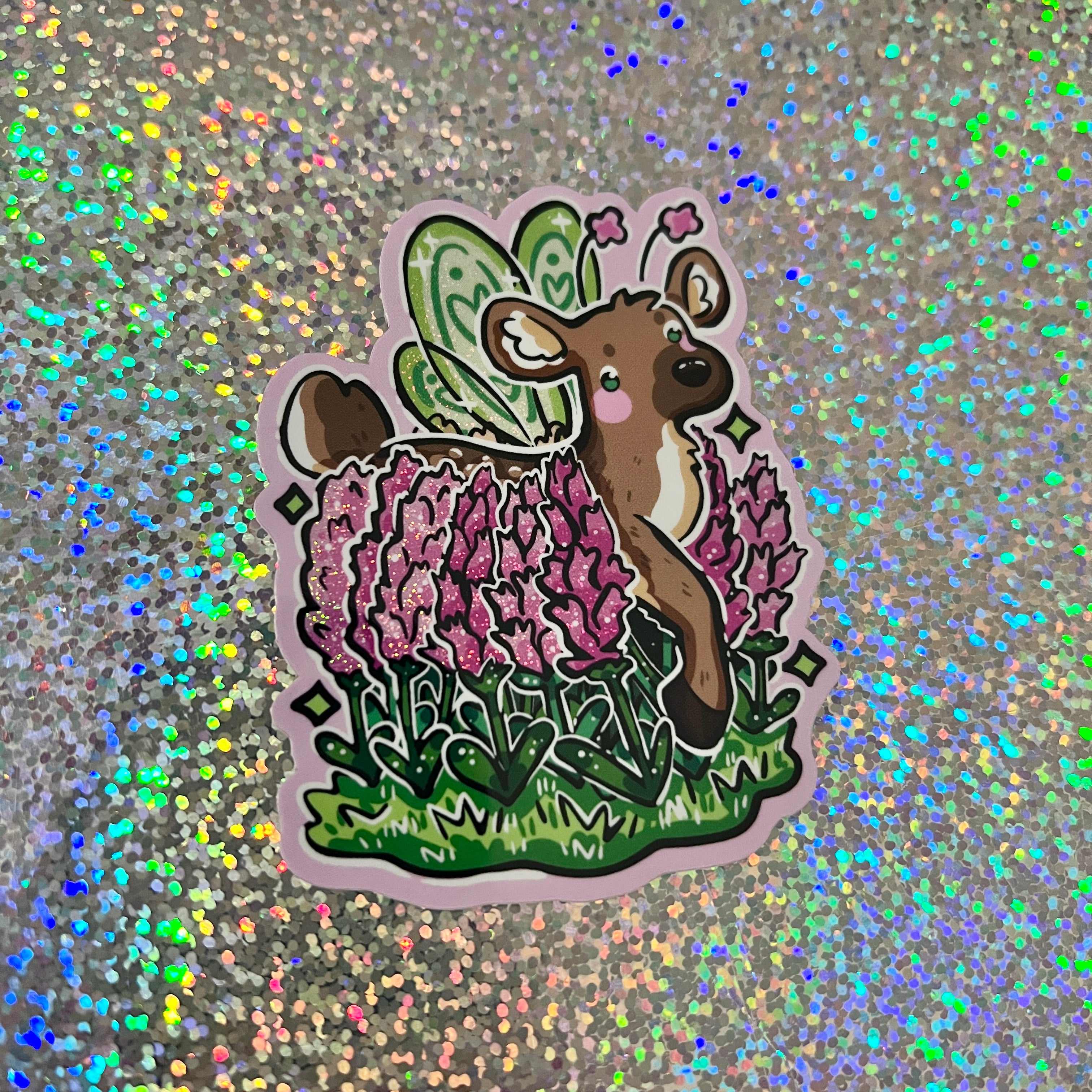 This glitter sticker features a timid fairy deer in a patch of Heather flowers! A magical and sparkly combo, this is the perfect sticker for anyone who loves fairies, deer, or unappreciated flowers. Put it on your water bottle for spring, or anywhere else for a pop of shimmer!