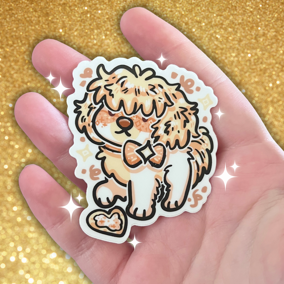 This is a leftover sticker from my Winter Delights Backerkit campaign from 2025! These designs features one of the 10 puppies from the campaign, each featuring a Winter celebration and tasty sweet- this sticker is Champagne the New Year's Creme Brulee Puppy who has just baked you a cookie! :D