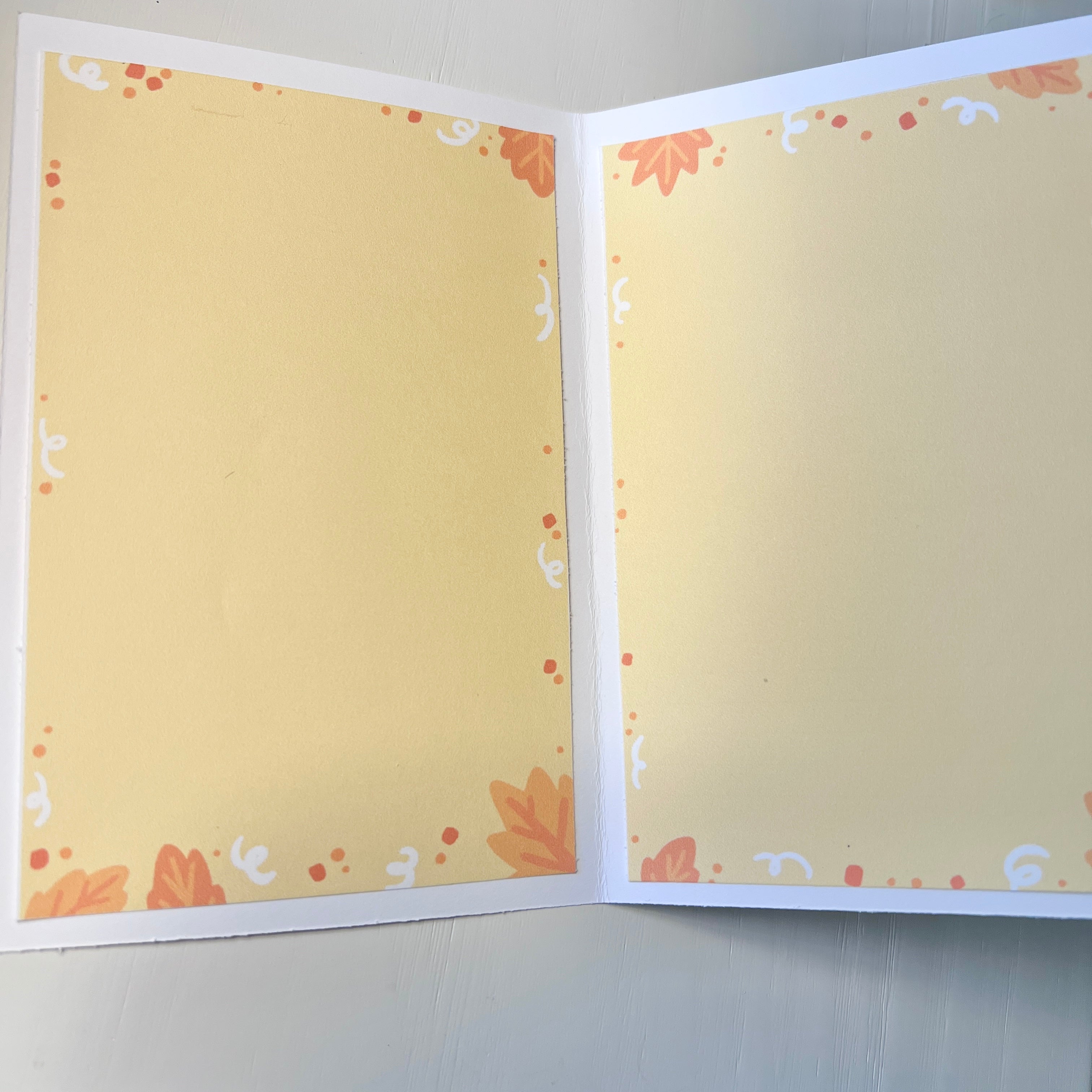 This home made greeting card is perfect for any general occasion, especially in the fall time! With a decorative matching interior, you have lots of space to write or doodle on the inside of the card!