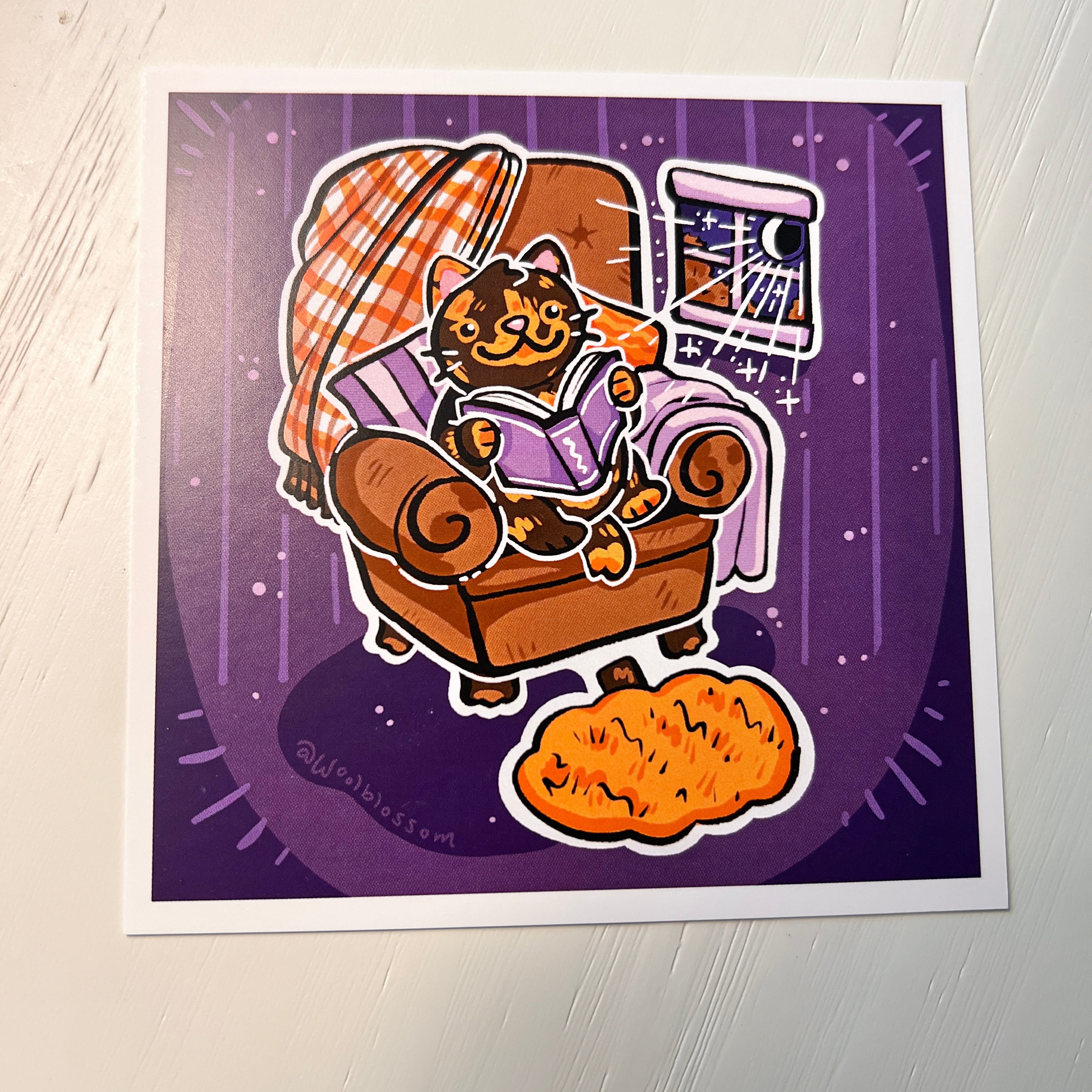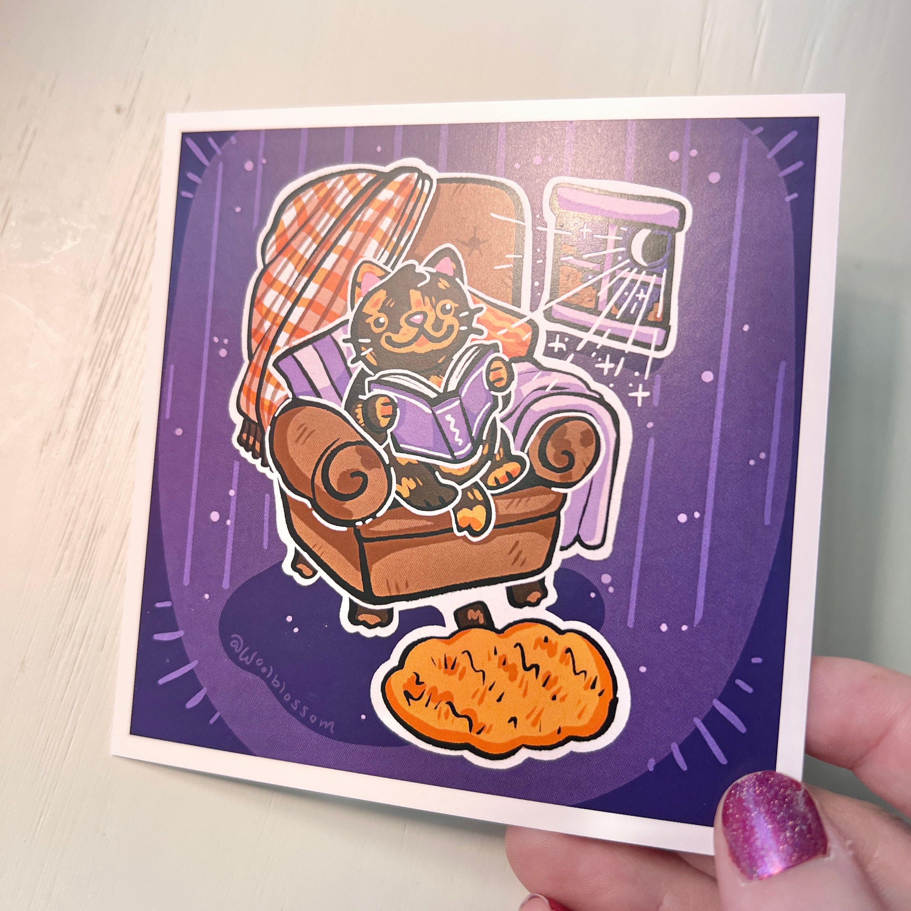 This tortie cat is doing some late night near Halloween reading! The perfect purple print for any bookish readers who love autumn- put it in your living room, office, and more to get ready for the season! :-)