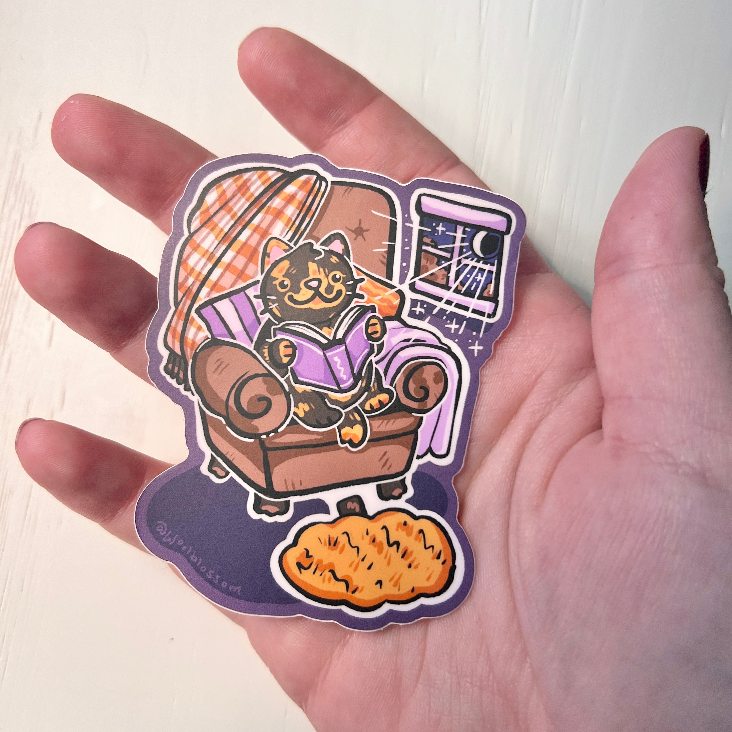 This tortie cat is doing some late night near Halloween reading! The perfect sticker for any bookish readers who love autumn- stick it on your scrapbook, laptop, and more to get ready for the season! :-)