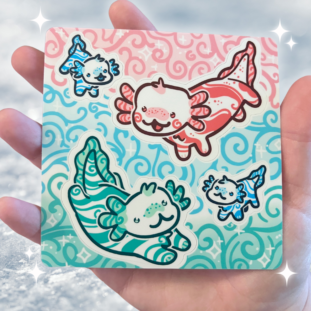 Celebrate the season with this peppermint inspired axolotl design- a festive sticker sheet filled with minty cheer! This design features peppermint and wintergreen axolotls floating with their two spearmint babies :-) Whether you're spreading festive joy or simply indulging in some seasonal decor, this sticker sheet has all the winter magic you need!