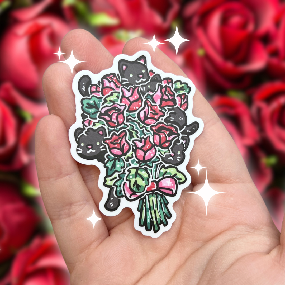 A charming sticker featuring a lush red and pink rose bouquet with a playful twist—tiny black kittens peeking out from among the flowers! The combination of vibrant blooms and cute kittens creates a whimsical, heartwarming design that's perfect for adding a touch of floral and feline magic to your belongings. Whether you're a cat lover, a flower enthusiast, or both, this sticker brings the best of both worlds together in one delightful package!