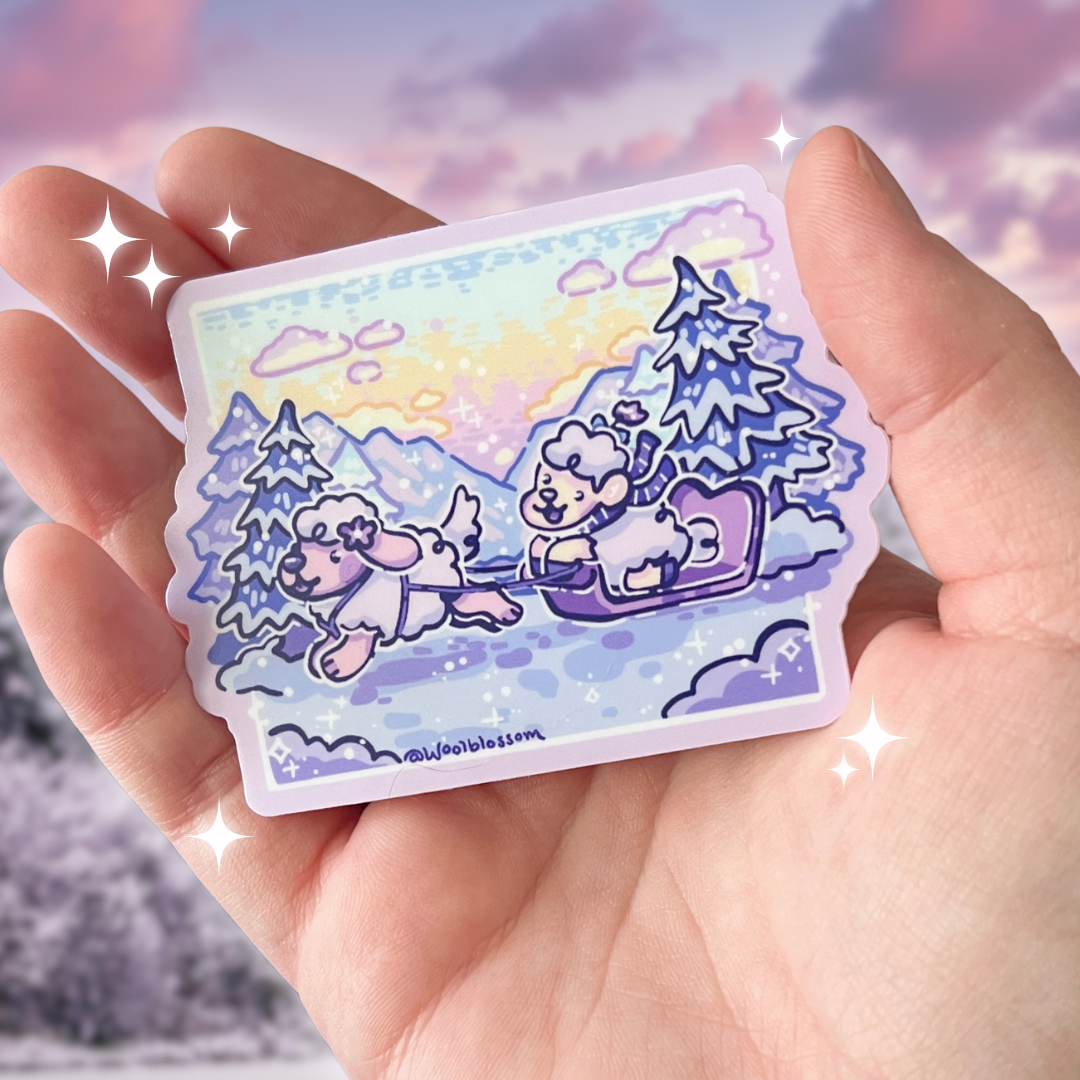Sprout the sheep and Cherry Blossom the sheep dog embark on a wintery adventure! This pretty pastel sticker is the perfect addition to any winter sticker collection :D
