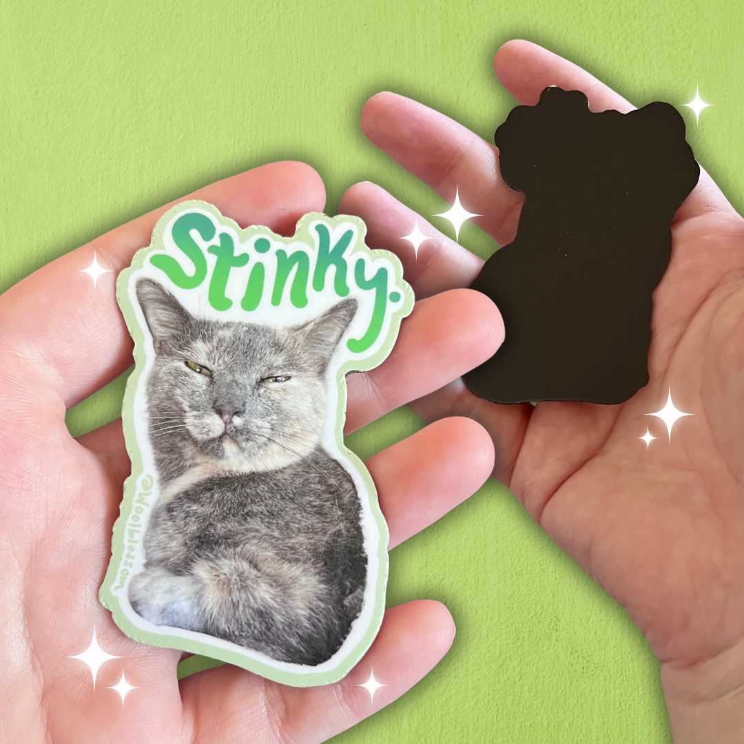 Chai ... she says the holder of this magnet is stinky...... the perfect magnet to give someone to tell them they are stinky.... or maybe they just like silly looking dilute tortie