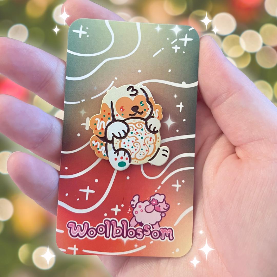 This is a leftover enamel pin from my Winter Delights Backerkit campaign from 2025! These designs features one of the 10 puppies from the campaign, each featuring a Winter celebration and tasty sweet- this pin is Caramel the Winter Sugar Cookie puppy holding one of her namesakes!