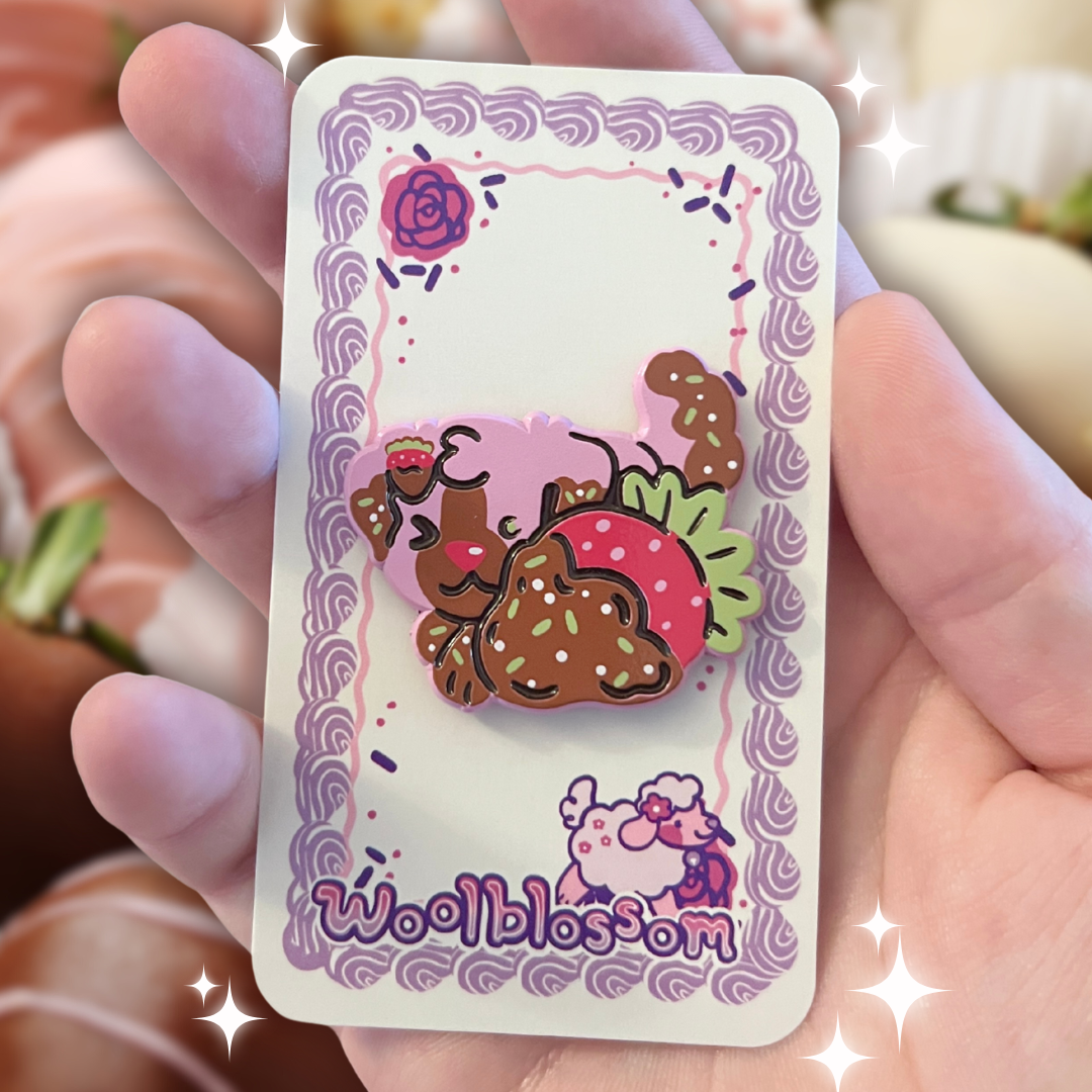 This is a leftover enamel pin from my Winter Delights Backerkit campaign from 2025! These designs features one of the 10 puppies from the campaign, each featuring a Winter celebration and tasty sweet- this pin is Coco the Valentine's Chocolate Strawberry puppy- hiding behind one of her namesakes!