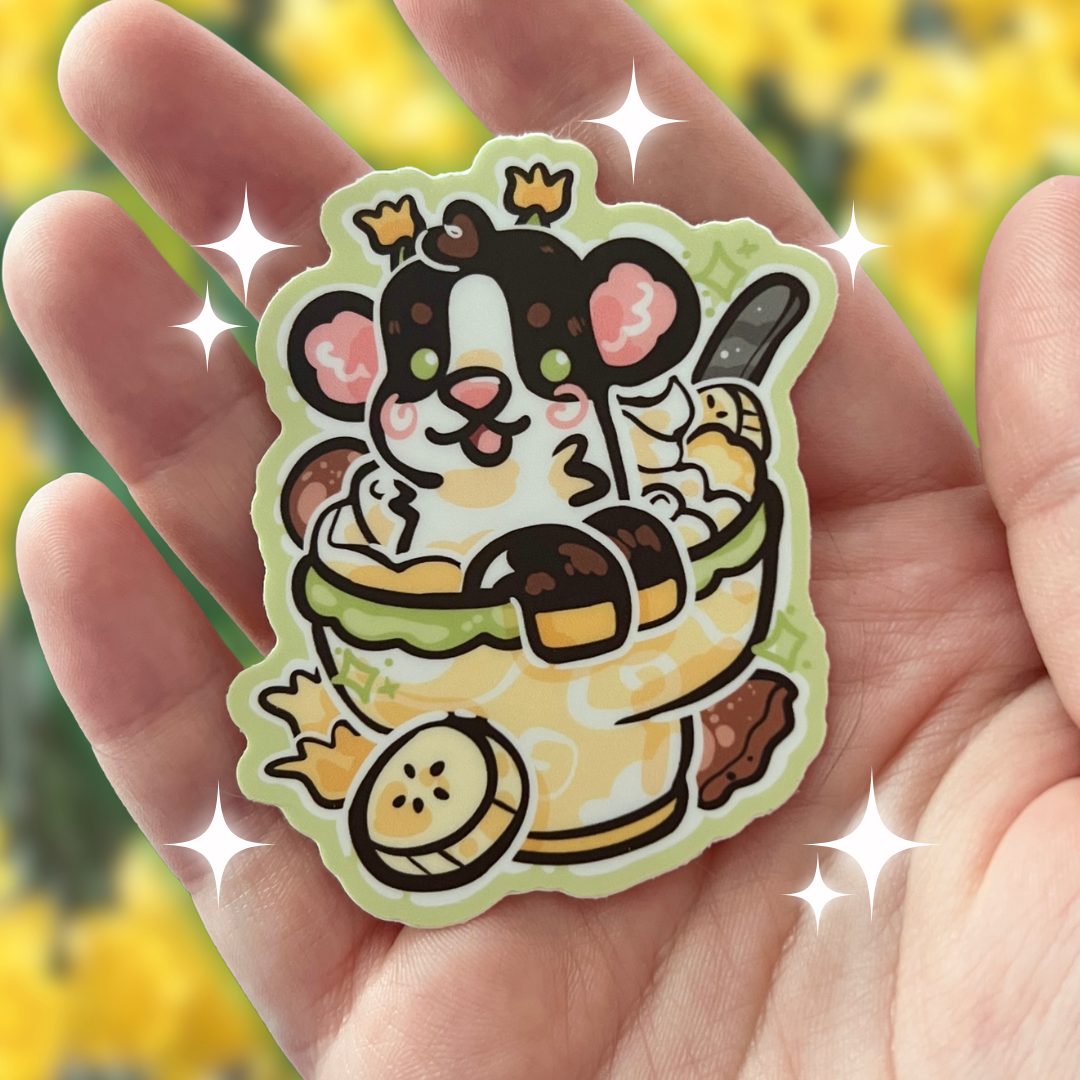 This is a silly combo of attributes! Alien boba cow :D her spots look like brown sugar boba pearls! On this sticker she's deep in her favorite little sweet treat- banana pudding! If you love dessert and silly cows, add this sticker to your collection today :D